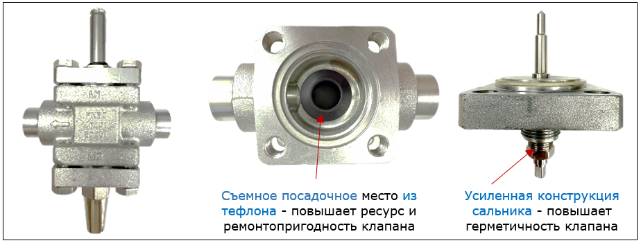 Седло и посадочное место клапана выполнены из тефлона для обеспечения лучшей герметичности. Съёмная конструкция посадочного места упрощает и удешевляет процесс ремонта и сервисного обслуживания.