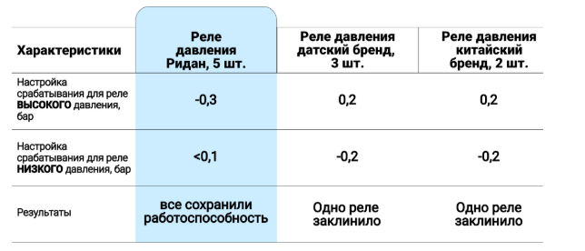 В испытаниях участвовали реле давления KP «Ридан» (нового и предыдущего поколений), модели: КР-1, КР-15, КР-15.